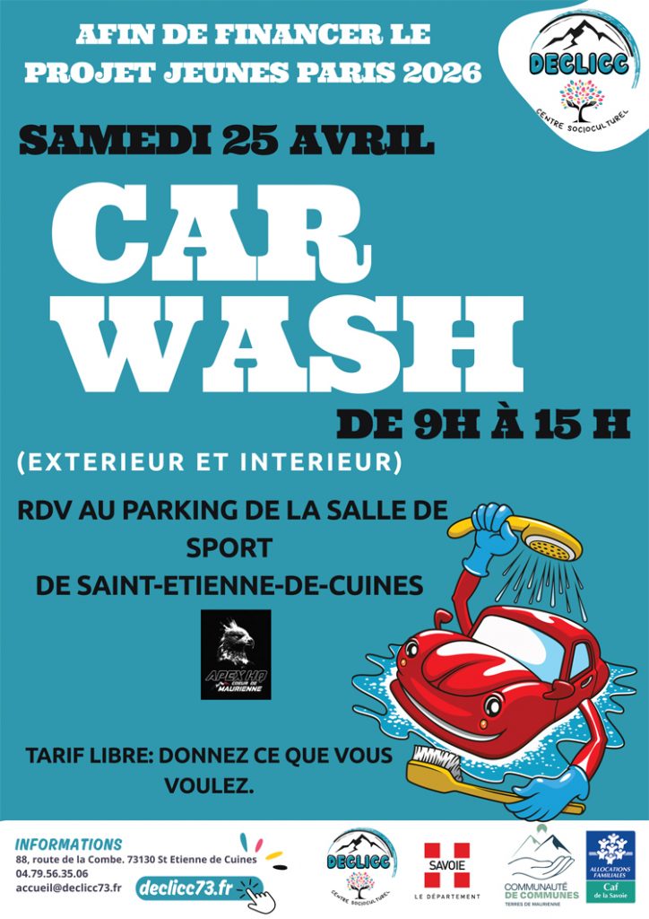 Afin de financer le projet Jeunes Paris 2026, le centre socioculturel DECLICC propose une action CAR-WASH samedi 25 avril 2026 de 9h00 à 15h00 sur le parking de la salle polyvalente.