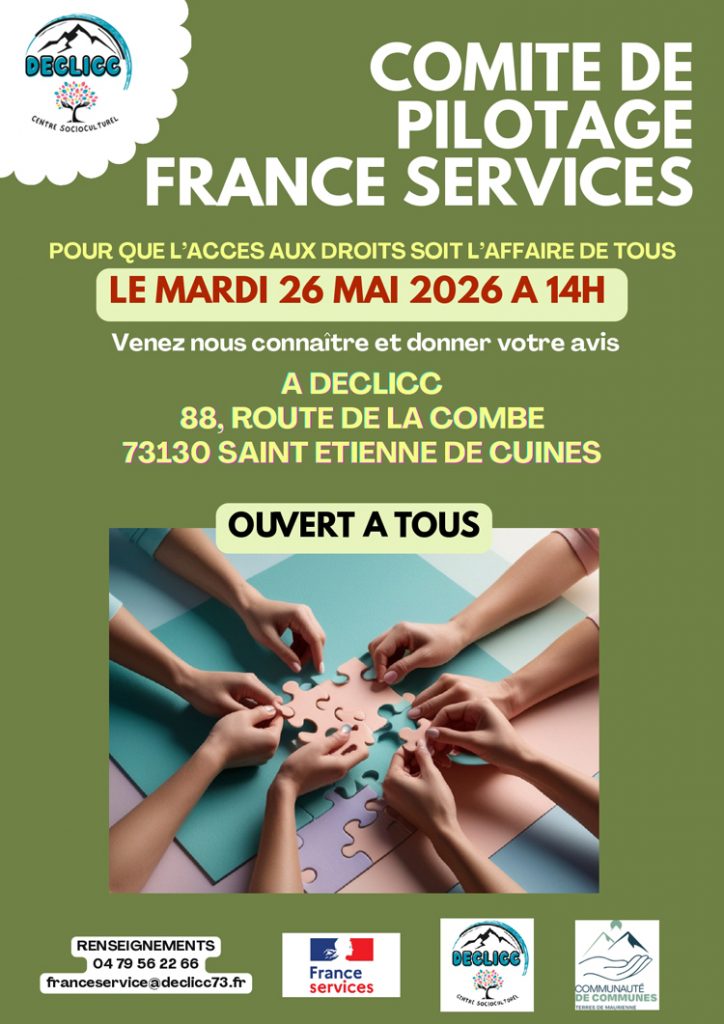 Dans le cadre de sa politique d’accès aux droits, la Communauté de communes Terres de Maurienne confie à DECLICC l’animation du dispositif France Services. À ce titre, DECLICC organise un comité de pilotage ouvert à tous les habitants, mardi 26 mai 2026 à 14h00, afin de mieux faire connaître les services proposés et recueillir les attentes du territoire.