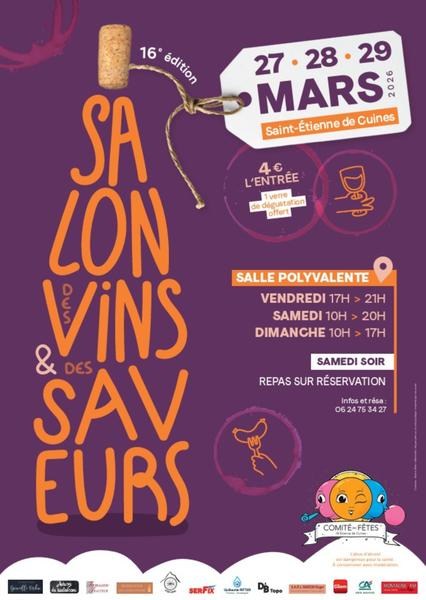 Le Comité des Fêtes de Saint-Étienne-de-Cuines organise son 16ème salon des vins et des saveurs et vous donne rendez-vous du vendredi 27 au dimanche 29 mars 2026 à la salle polyvalente.
