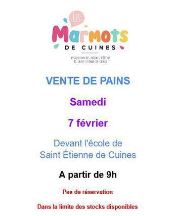 L’association Les Marmots de Cuines organise une vente de pains devant l’école primaire de Saint Étienne de Cuines, samedi 7 février 2026 dès 9h00.